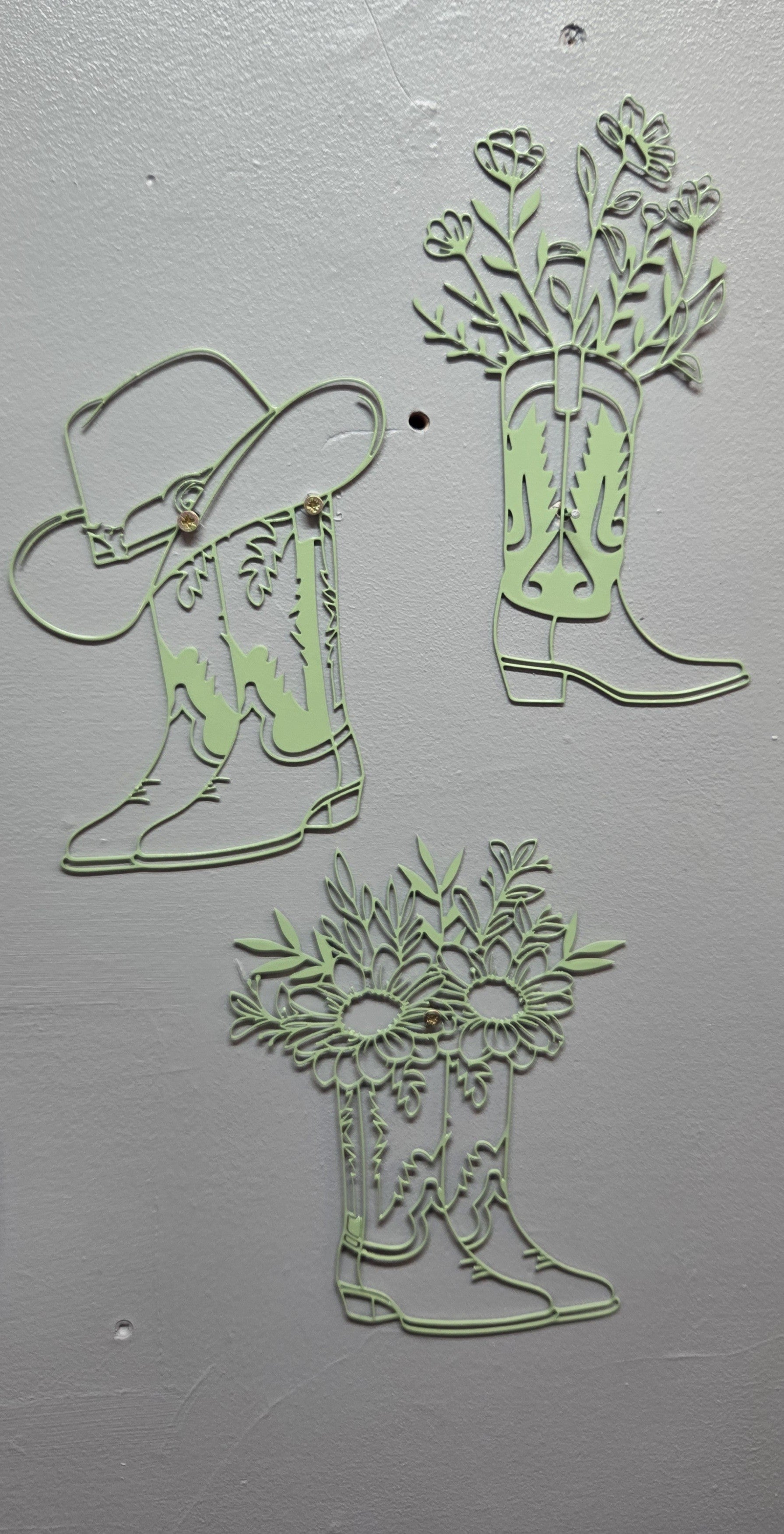 Add rustic charm to your space with this trio of metal wall art featuring intricately crafted cowboy boots. Perfect for Western-themed décor, each piece brings rugged elegance and a touch of the wild frontier to any wall.
